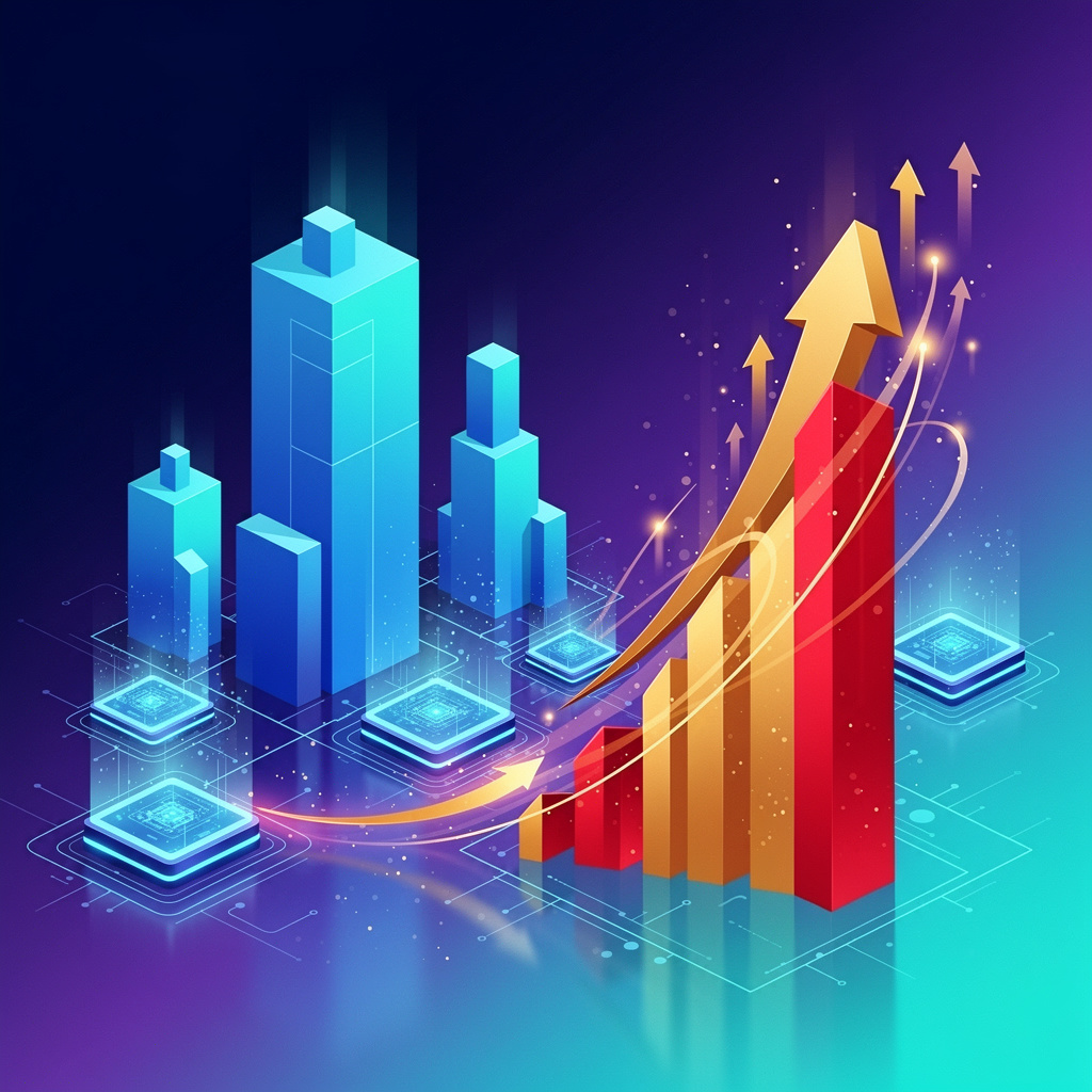 A dynamic scene showing stock market charts with a downward trend, overlaid with abstract AI circuit patterns, bright balanced lighting, textured background, no text.