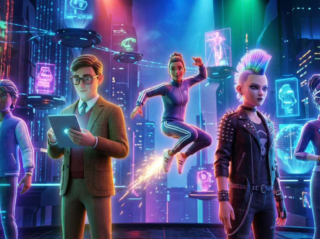 An energetic and bright digital persona interacting with a crowd of light particles on a futuristic stage, vibrant blue and purple neon lights, dynamic composition, 4:3