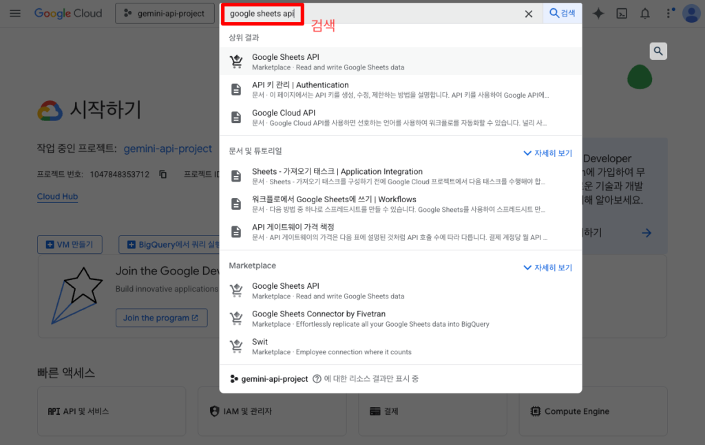 - 검색창에 Google Sheets API 입력 후 선택