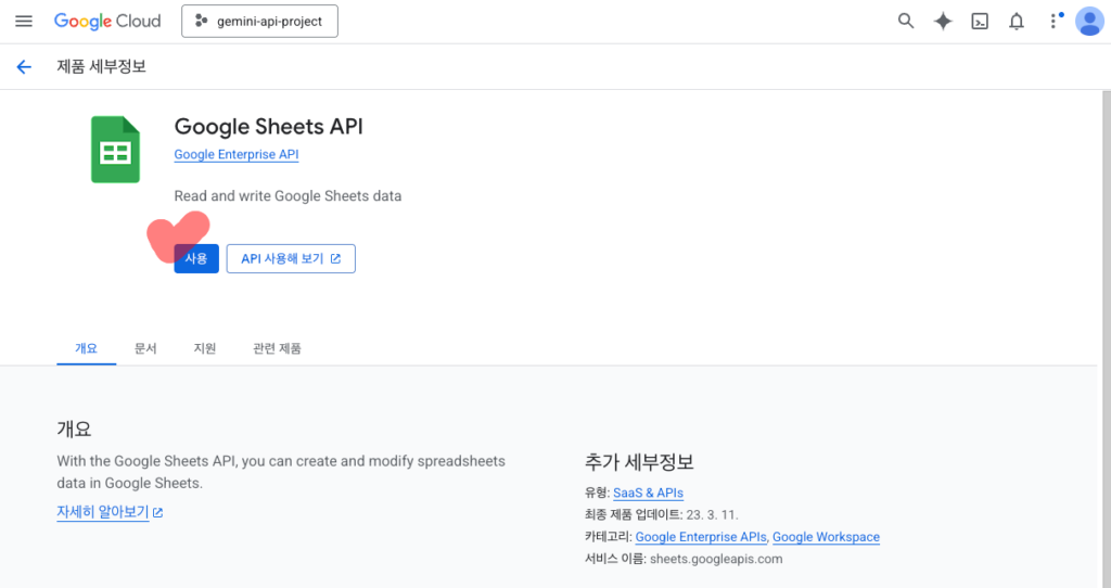 프로젝트가 준비되었다면 이제 해당 프로젝트에서 구글 시트의 기능을 빌려 쓸 수 있도록 허가해줘야 합니다. 검색창에 단어를 입력하면 관련 항목이 나오는데 여기서 우리가 필요한 API를 찾아 사용 설정 버튼을 눌러주면 됩니다.