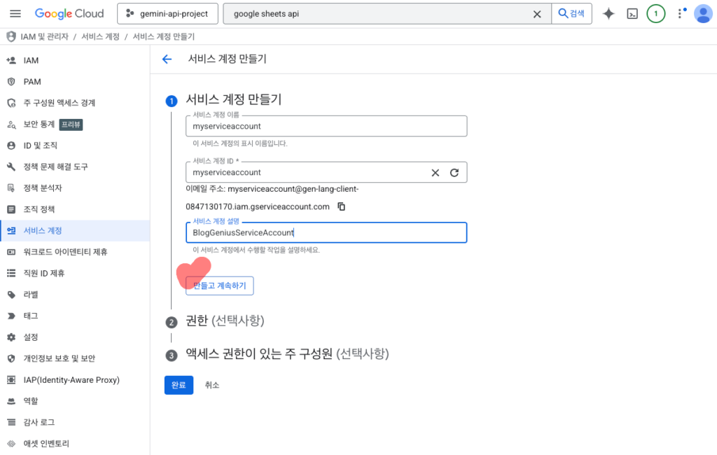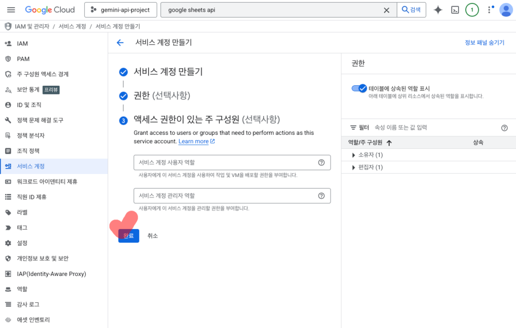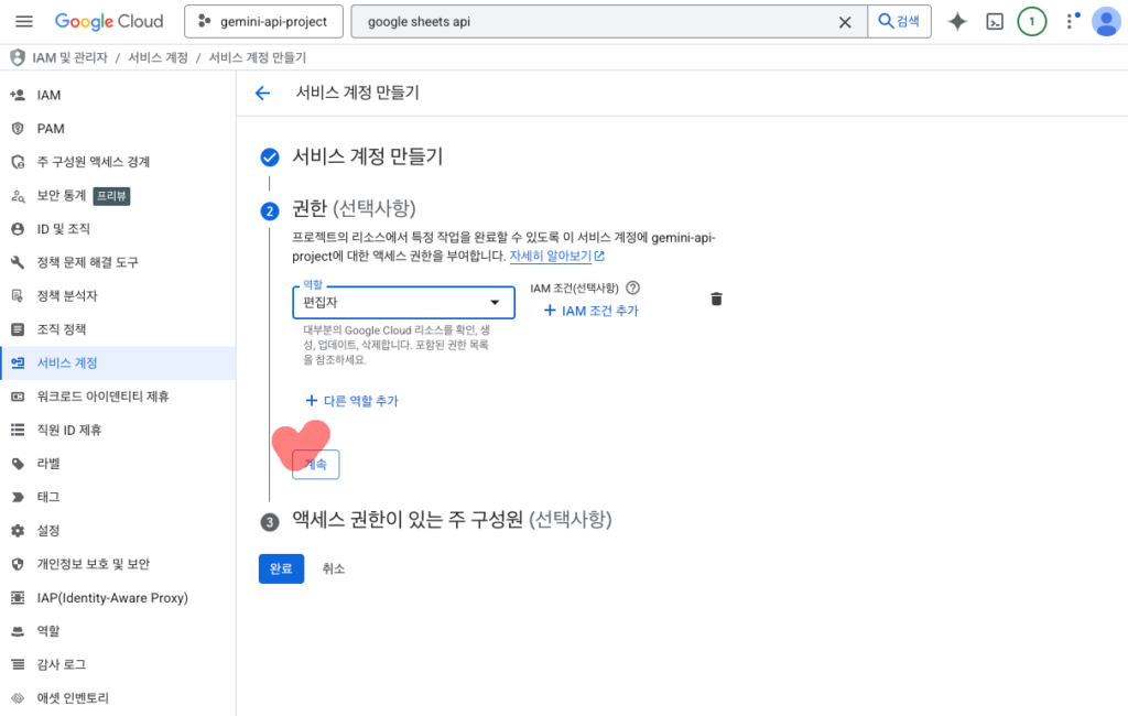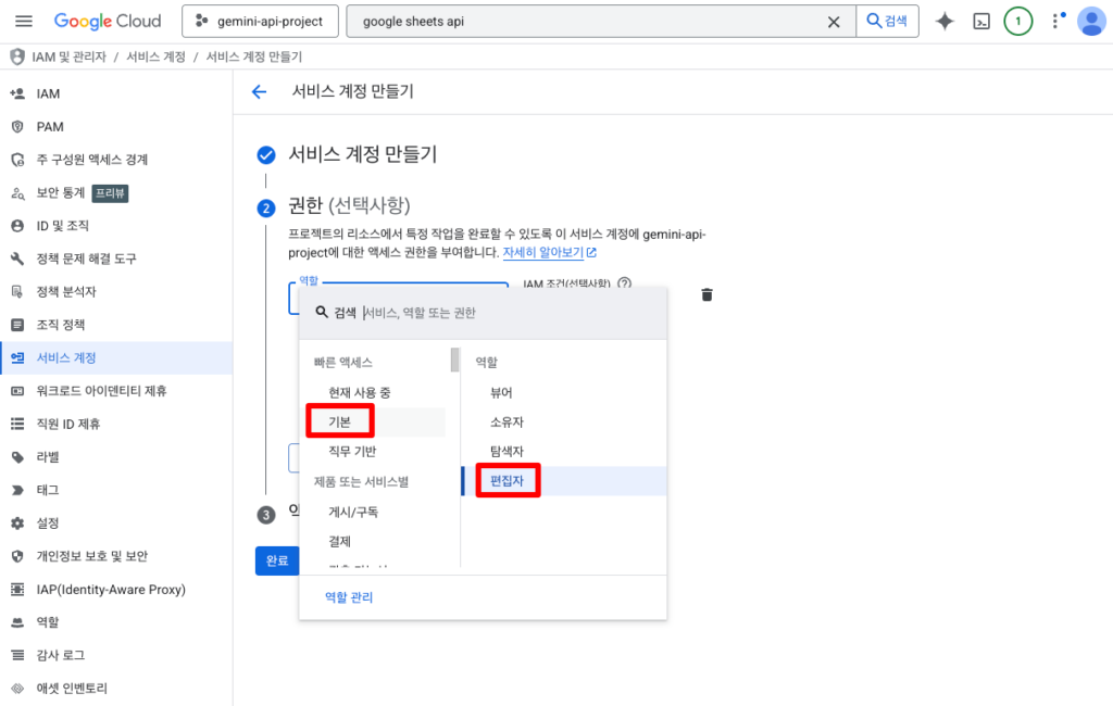 여기서 설정한 역할은 이 계정이 구글 클라우드 내에서 가지는 전반적인 권한입니다. 하지만 실제 개별 시트 파일에 대한 권한은 나중에 별도로 설정해야 하니 일단 편집자로 지정해두는 것이 작업하기 편하더라고요.