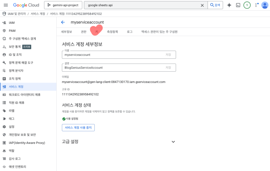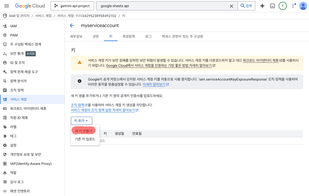 계정 생성이 끝났다면 이제 내 프로그램이 이 계정임을 증명할 수 있는 신분증이 필요합니다. 생성된 서비스 계정의 상세 페이지로 들어가서 키 탭을 클릭하세요. 새 키 만들기를 선택하고 형식을 JSON으로 지정하면 파일이 자동으로 컴퓨터에 저장됩니다.