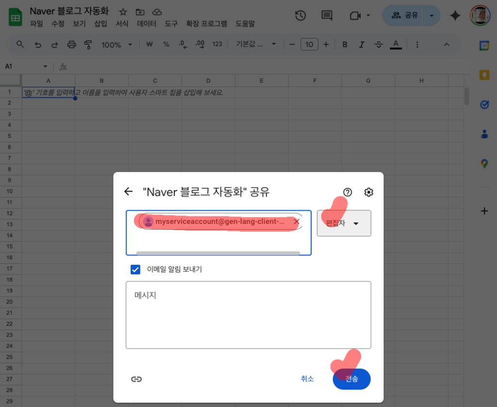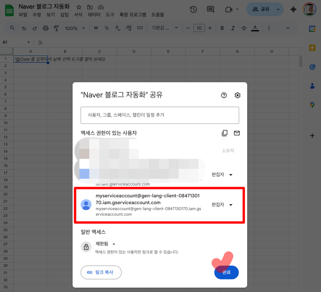 우리가 지인에게 시트를 공유하듯이 서비스 계정 이메일에게도 똑같이 문을 열어줘야 합니다. 이 과정을 거쳐야만 비로소 프로그램이 시트 내부의 데이터를 읽고 쓸 수 있는 상태가 됩니다.