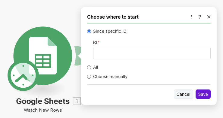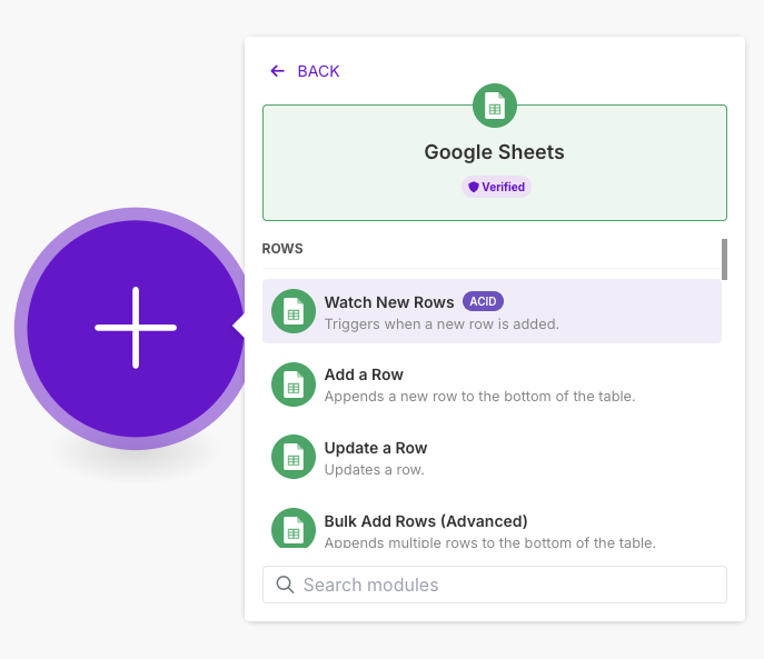 첫 번째 단계는 구글 스프레드시트에서 데이터를 읽어오는 트리거를 설정하는 거예요. make에서 ‘Google Sheets’ 모듈 -> Watch New Rows (ACID)’을 검색해서 추가해주세요.