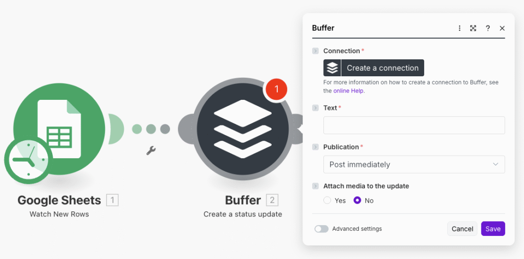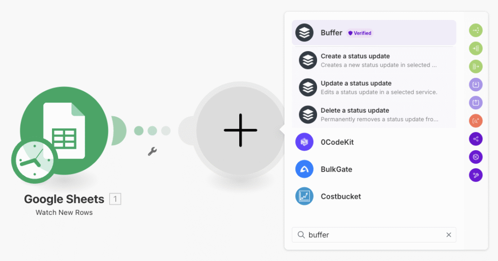 앞서 설정한 구글 스프레드시트 다음에 buffer 모듈이 붙을 것이니 스프레드시트 옆에 있는 (+) 버튼을 눌러서 buffer 모듈을 추가해줍니다. 우리는 buffer에 글을 발행할 것이니 Create a status update 를 택하면 됩니다.