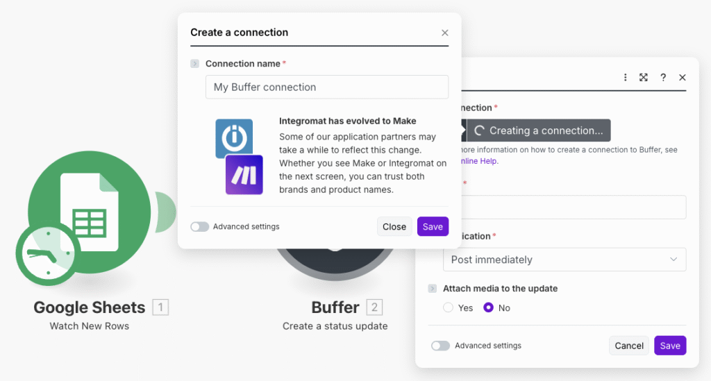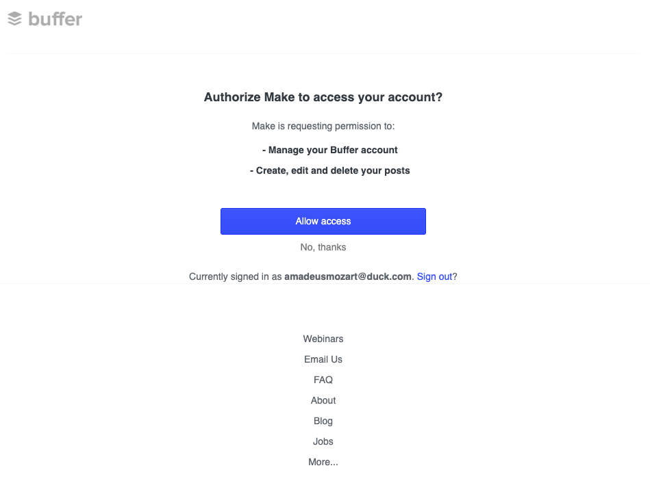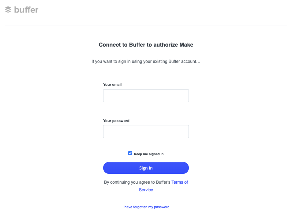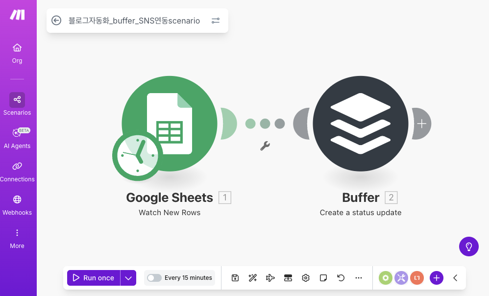 두 번째 단계에서는 buffer 서비스와의 연동을 설정해요. make에서 buffer 모듈을 찾아서 추가하고, API 연결을 위한 인증을 진행해주세요.
