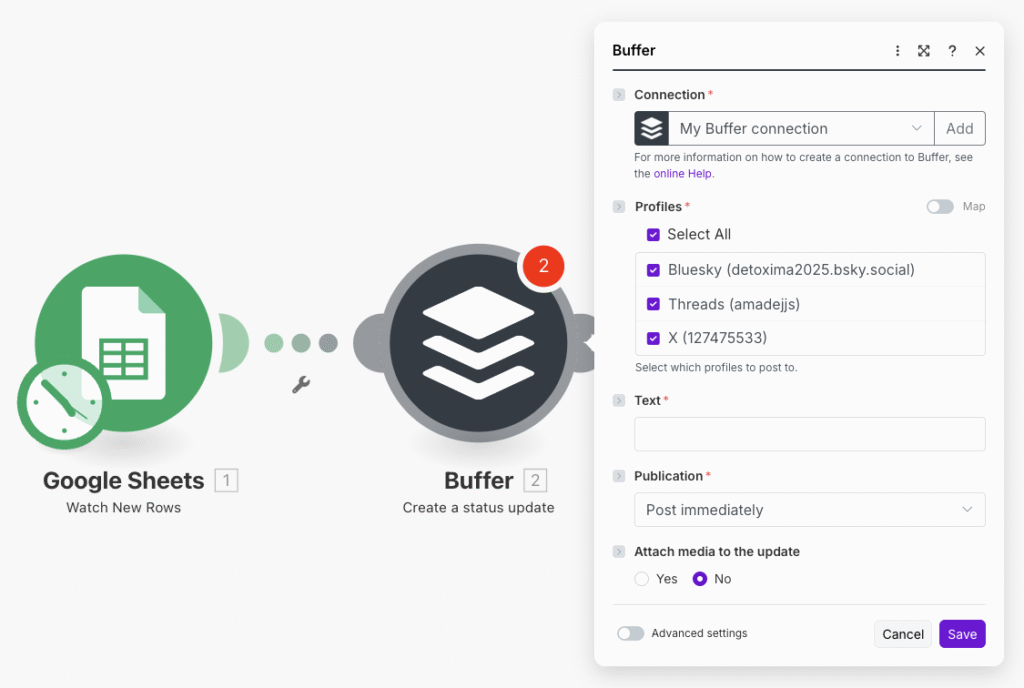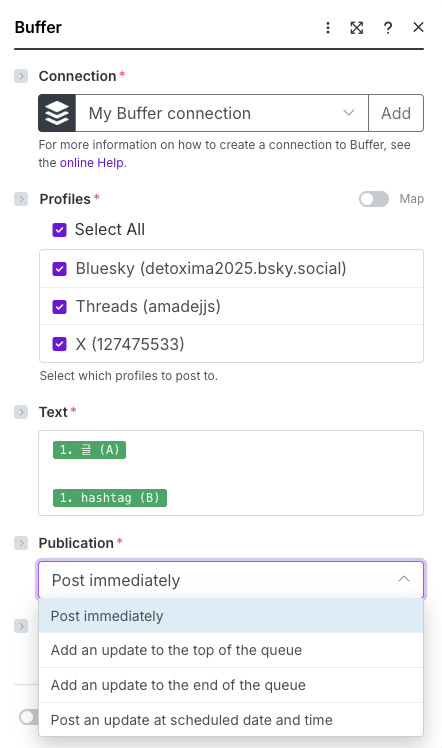 따로 buffer.com을 브라우저에서 접속해서 미리 threads, bluesky, X(twitter) 계정을 연결(채널 설정)해두셔야 해요. 그 이후에 make의 buffer 모듈에서 ‘Connect a connection’ 메뉴를 통해 buffer에 접속 인증/인가를 하면 기 설정한 SNS 플랫폼 목록(채널)이 나와서 선택하면 됩니다. 말로는 긴데 실제 해보면 무척 쉬워요.