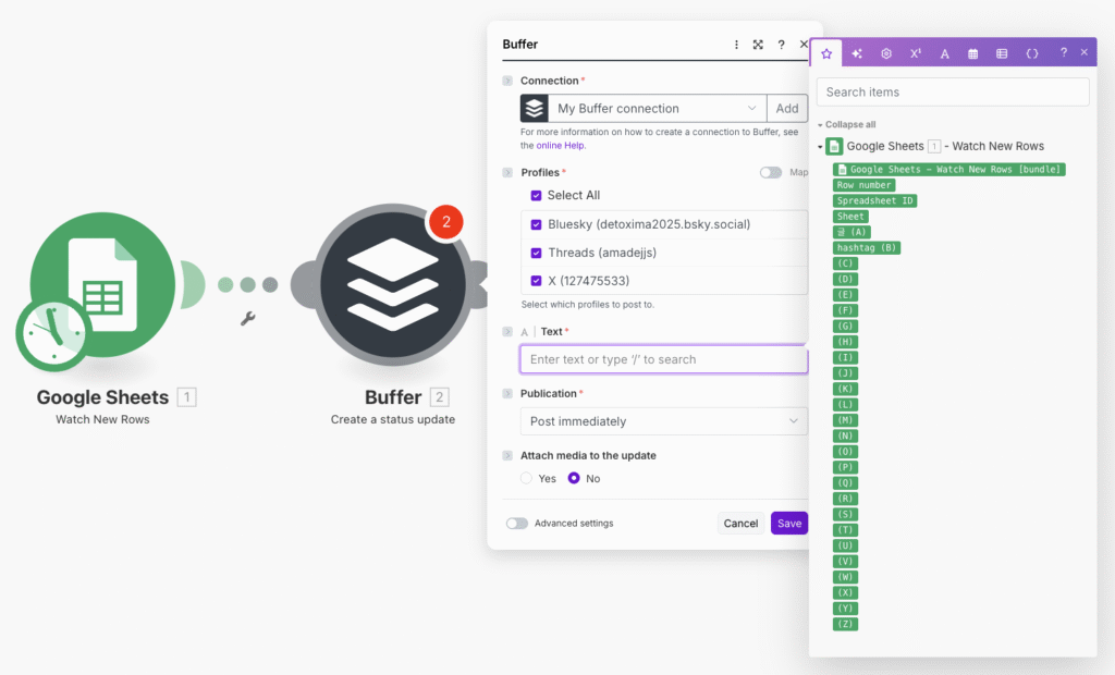 make 자동화 시나리오 실습을 통해 구글 스프레드시트에서 buffer.com까지 연결하는 SNS 자동 발행 시스템을 만들어보세요. 이번 실습에서는 threads, bluesky, X(twitter) 3개 플랫폼에 동시 발행하는 워크플로우를 단계별로 구현해보겠어요.