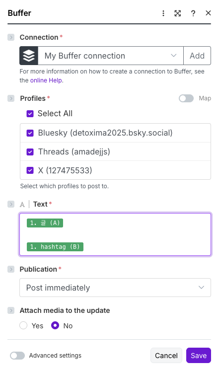 위의 화면처럼 이제 Buffer로 연결이 되어서 이미 설정해놓은 채널(Bluesky, Threads, X) 목록을 가져왔고 이 Buffer 모듈을 통해서 연동할 채널을 선택하면 됩니다. 저는 모든 채널을 선택했습니다.