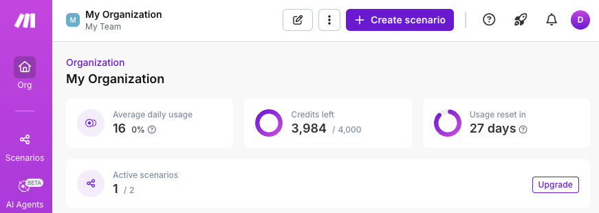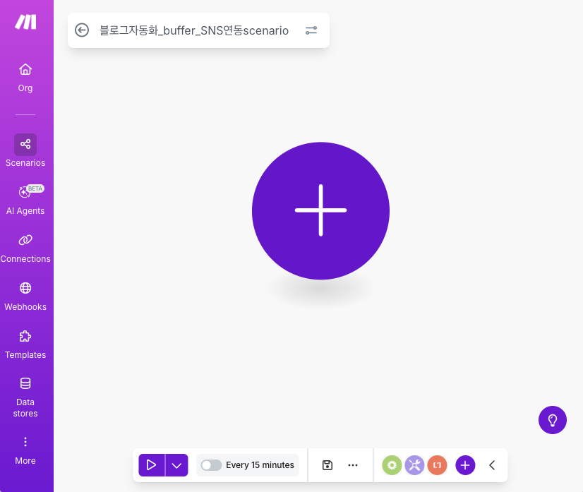 make.com에 로그인하신 후 새로운 시나리오를 생성해주세요. 처음 화면에서 ‘Create scenario’ 버튼을 클릭하면 시작할 수 있어요. 이제 본격적인 자동화 시나리오 설계에 들어가보겠습니다.