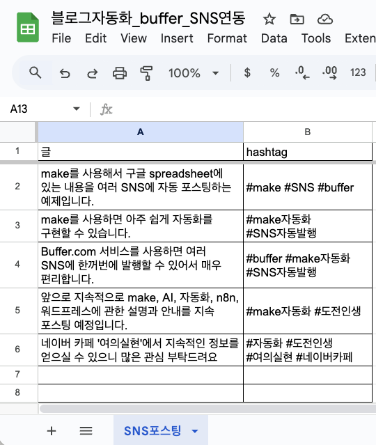 - 스프레드시트 이름: 블로그자동화_buffer_SNS연동