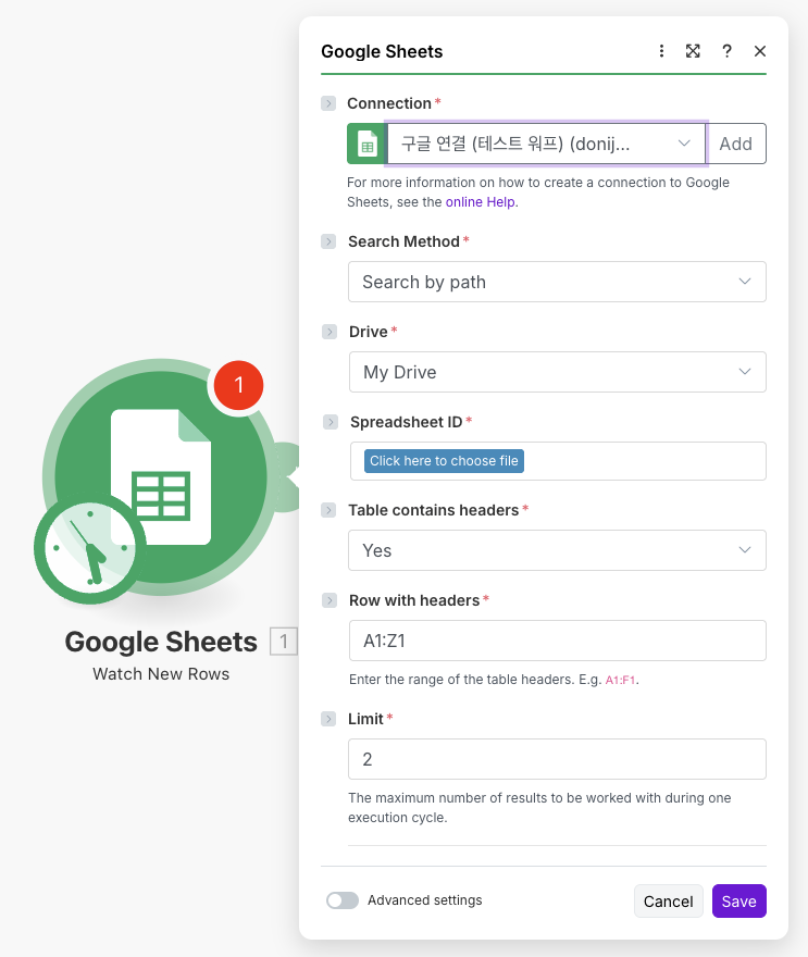 앞에서 이미 구글에 로그인해서 구글 스프레드시트에 접속할 권한을 허용했기에 이 모듈에서는 여러분의 시트 목록을 보여줍니다. 따라서 주관식으로 쓸 필요없이 드롭다운에서 원하는 스프레드시트와 시트이름을 선택하면 됩니다. 무척 쉽죠.