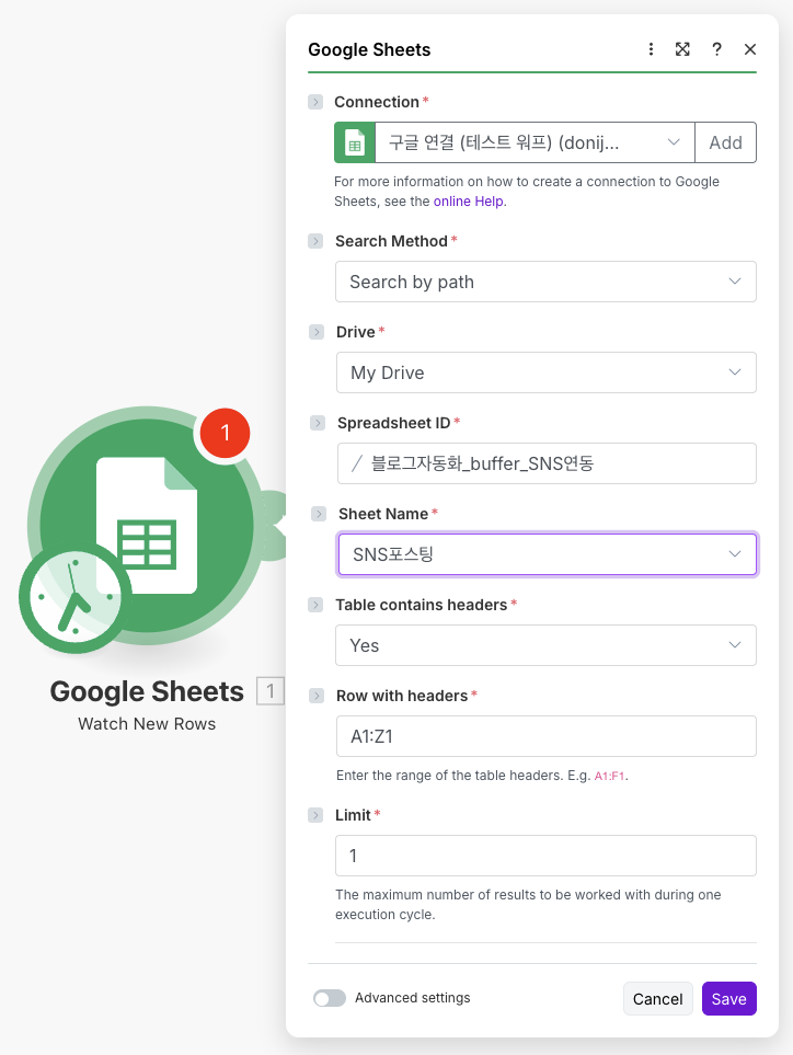 위의 캡처처럼 설정하면 아까 만든 스프레드시트인 ‘블로그자동화_buffer_SNS연동’의 ‘SNS포스팅’ 시트에서 한줄씩 내용을 가져오게 됩니다.
