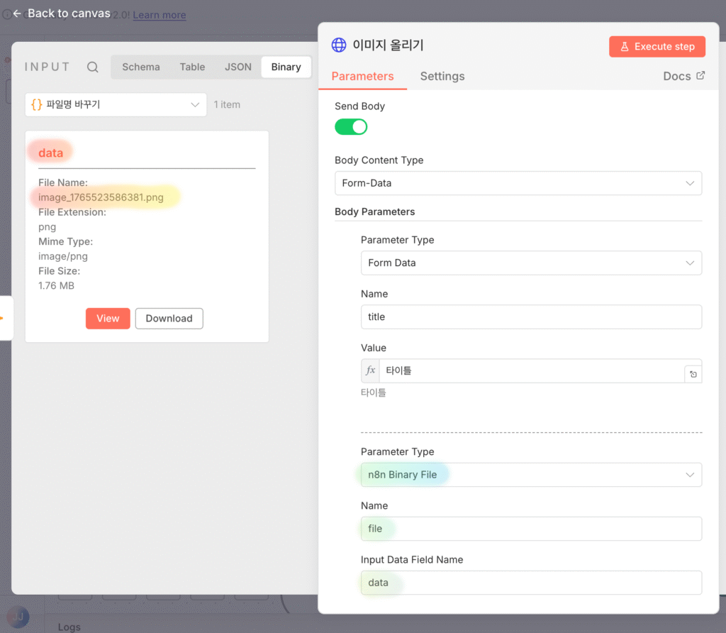 YOUR_WORDPRESS_URL>/wp-json/wp/v2/media - Body 데이터: 이미지 파일 자체의 바이너리 데이터를 Body에 직접 넣어야 해요. n8n에서 Gemini 모듈로 생성된 이미지 데이터는 보통 바이너리 형태로 제공되니, 이를 그대로 활용하면 돼요.